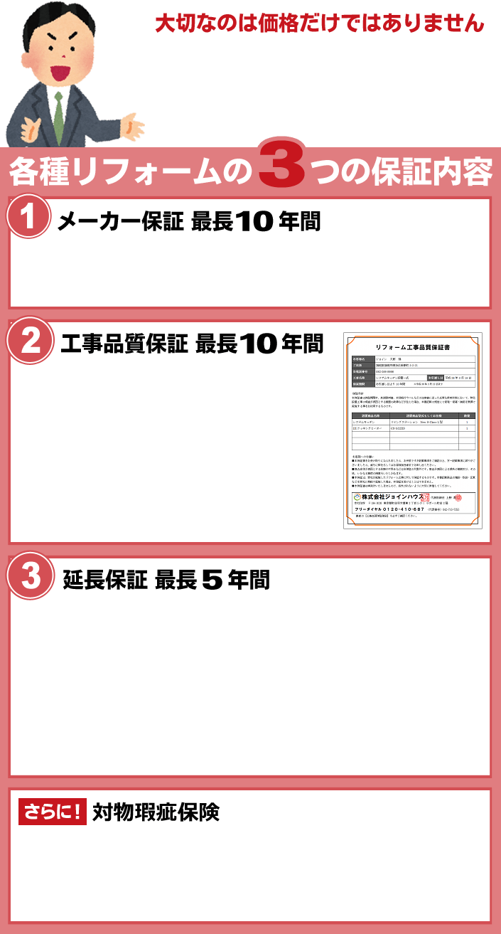 ※保証期間、保証内容はリフォーム内容により異なります。詳しくは担当者までお尋ねください。
