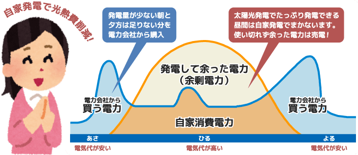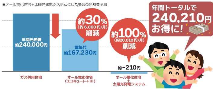 オール電化住宅に太陽光発電システムを導入することにより、昼間は太陽光発電システムで昼間の使用電力をまかない、使わず余った電力は売電して売電収入=光熱費削減。夜間はエコキュートが電気料金が割安な時間帯でお湯を作るのでさらに光熱費を抑えられます。