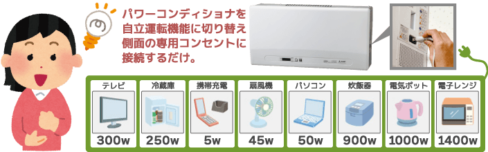災害などで停電になってしまった時でも、太陽光発電システムで発電できる状態であれば、自立運転に切り替えることで最大1500W(AC100V)までの電気を賄うことが出来ます。ご家庭内にある電気機器すべてを長時間使えるわけではありませんが、万一の際に最低限の電気が使えるのは心強く大変助かります。
