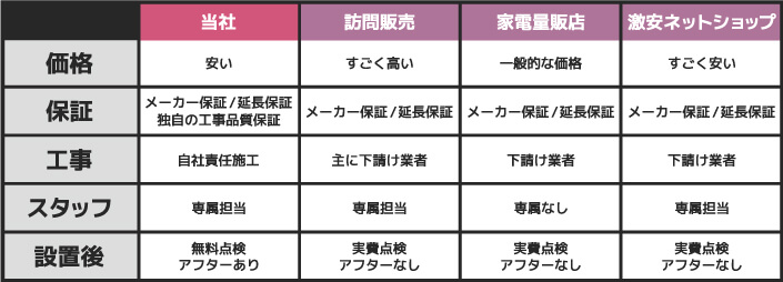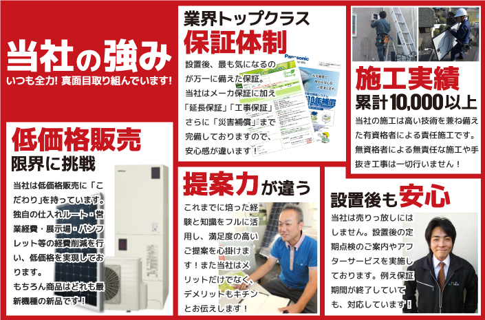 当社は専門業者としてお客様からご満足いただけるサービス提供を心掛けております。価格・施工内容・保証など、どれも他社様には劣らない、負けない内容であると自信があります!