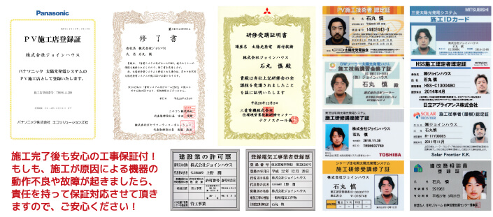 当社は経験豊富な施工職人による丁寧な設置工事を行っております。国家資格に加え、当社が取り扱う太陽光発電システム各メーカーの施工研修を受け、施工IDも取得しております!